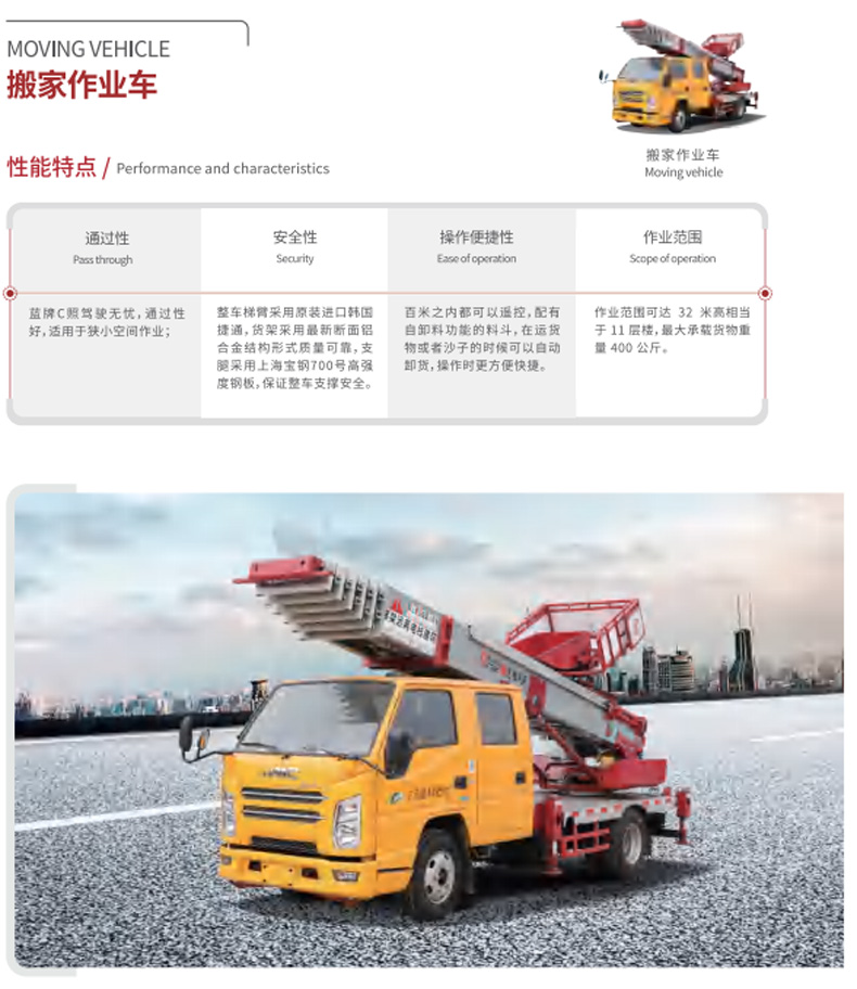 高空作業車價格_高空作業車廠家_楚勝集團★13908669111★江鈴30米搬家作業車產品名稱:楚勝牌CSC5041TBA6J30型搬家作業車,采用江鈴JX1041TSG26底盤改裝而成,該車專用裝置為云梯梯臂,主要用于搬家作業。作業范圍可達32米高相當于11層樓,最大承載貨物重量400公斤。本公司專業生產銷售各類伸縮臂高空作業車,折疊臂高空作業車,液壓升降車,搬家云梯車,外形美觀,操作方便,節省燃油。更多高空作業車盡在:m.erssigu.com