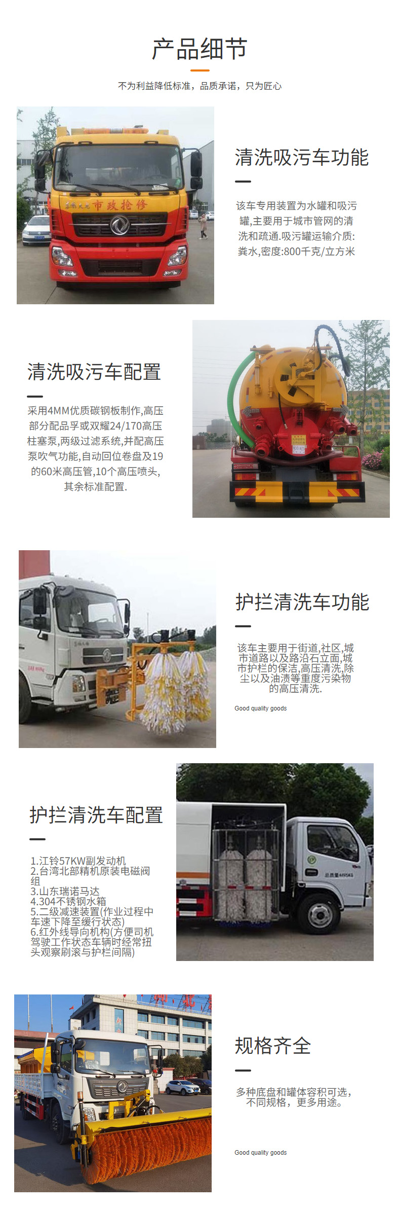 ★清洗車專用部分由上取力器、傳動軸、高壓水泵、罐體(位于車輛前部,與吸污罐體是分離式)、自動卷盤、高壓水管、多路換向閥、卷盤操作閥組成。高壓水泵壓力:16-19Mpa 、流量:8m3/h 、水管長度:60/100m。常配10個噴頭。清洗路面加裝前噴水架,噴水架清洗寬度2.5m-3.5m,噴水架可升降、伸縮、左右平移,可實現多重水流強化清洗,適用于清洗城市道路、廣場。