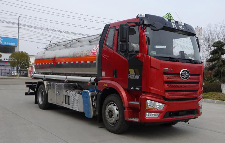 罐體總?cè)萘?13.9立方米,罐體有效容積:13.2立方米,危險貨物運輸車輛的類型:FL型車輛,介質(zhì)zui大密度830千克/立方米;罐體尺寸(長×長軸×短軸)(mm)為:5700×2100×1500;僅采用4700(mm)軸距;選裝罐體兩側(cè)管廂樣式及出口箱樣式;側(cè)、后防護裝置材料材質(zhì):Q235B,側(cè)、后防護均用螺栓連接,后部防護裝置斷面尺寸(寬×高)80×150(mm),后部防護離地高度:490mm;安裝具有衛(wèi)星定位功能的行駛記錄儀,僅采用子午線輪胎,前輪裝配盤式制動器,排氣消聲器及排氣管前置;安裝限速裝置,限速79km/h;安裝EBS,型號:EBS3,生產(chǎn)廠家:威伯科汽車控制系統(tǒng)(中國)有限公司;僅適用發(fā)動機對應(yīng)油耗值(L/100km)為:CA4DK1-22E61(22.0),CA4DK1-18E61(22.0),CA4DK1A18E61(22.0), CA6DH1-24E61(23.9).該車后軸采用空氣懸架;轉(zhuǎn)向輪安裝爆胎應(yīng)急防護裝置;選裝直接供電式ETC車載裝置;