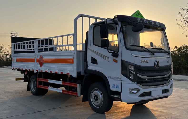 1.該車適用于運輸危險品,運輸具有獨立容器(瓶)包裝的物品.運送危險物品類項號:2.1,2.2;2.后部帶液壓尾板時,側、后防護材料均為Q235,側、后防護連接方式均為螺栓連接,后防護截面尺寸直徑120mm,下邊緣離地高420mm;選裝后部無液壓尾板時,后防護材料為Q235,螺栓連接,后防護截面尺寸120mm×50mm,下邊緣離地高420mm;3.液壓尾板收起狀態水平長度為300mm,起重尾板質量為420kg;4.僅采用前輪盤式制動器,前置排氣管,子午線輪胎, 裝備限速裝置,限速80km/h;轉向輪安裝爆胎應急防護裝置;發動機型號及油耗值(L/100km):YCY30165-60/19.7,D30TCIF1/19.8.ABS生產廠家/型號:3631010-C2000/東科克諾爾商用車制動系統(十堰)有限公司,J ABS/焦作博瑞克控制技術有限公司;5.該車型可選裝直接供電式ETC車載裝置,該車安裝具有衛星定位功能的行駛記錄儀.隨底盤選裝駕駛室,選裝窄輪罩,選裝欄板樣式,選裝不帶尾板后部樣式,選裝液壓尾板樣式.隨底盤選裝電瓶框,尿素罐,油箱布置位置.